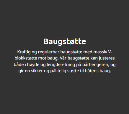 - Kraftig baugstøtte: Baugstøtten kan justeres både i høyde og lengderetning. Den er utstyrt med en massiv V-blokkstøtte som gir stabil støtte til båtens baug.