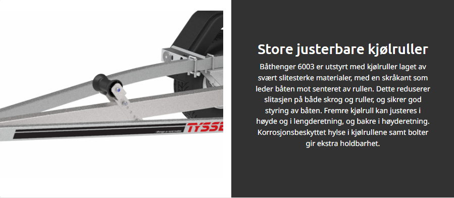 - Kjølruller med suverene rulleegenskaper: Vår båthenger har kjølruller laget av svært slitesterke materialer, med en skråkant som leder båten mot senteret av rullen. Dette reduserer slitasjen på både skrog og ruller, og sikrer god styring av båten. Fremre kjølrull kan justeres i høyde og i lengderetning, og bakre i høyderetning. Korrosjonsbeskyttet hylse i kjølrullene samt bolter gir ekstra holdbarhet.
