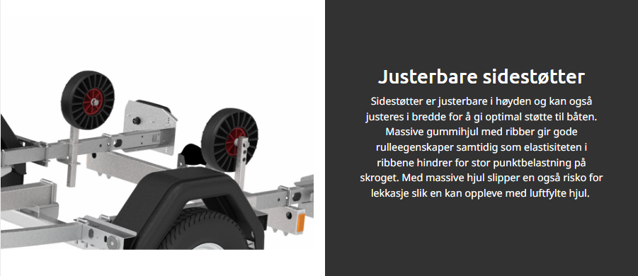 - Justerbare sidestøtter: Sidestøtter er justerbare i høyden for å gi best mulig støtte til båten. Massive gummihjul med ribber gir gode rulleegenskaper samtidig som elastisiteten i ribbene hindrer for stor punktbelastning på skroget. Med massive hjul slipper en også risiko for lekkasje slik en kan oppleve med luftfylte hjul.