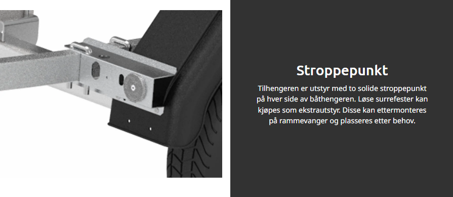 - Solide stroppepunkter: Med ulike skrogformer er det avgjørende med gode surrefestene på hengeren for å sikre optimal stropping av båten. Vår båthenger har solide stroppepunkter for dette formålet.