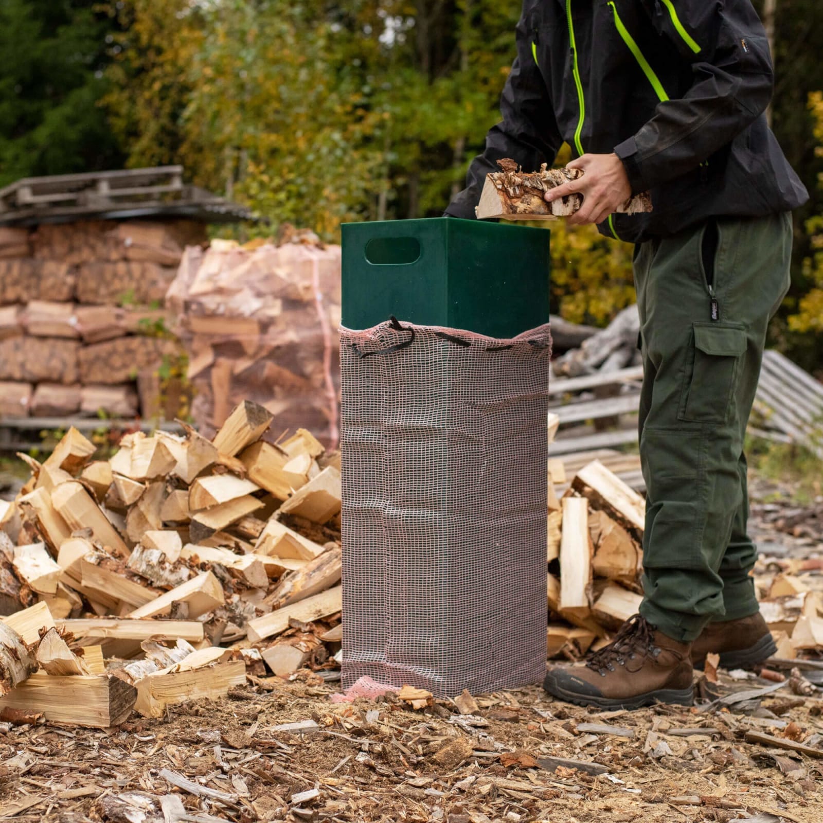 - Sekken tres utenpå kanalen, før man slipper veden ned i kanalen. På denne måten unngår man at veden henger seg fast i nettingen.
