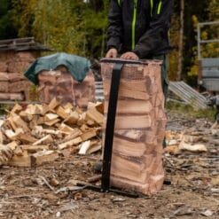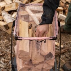 - Småsekken spennes opp mellom de to armene, før man fyller opp med ved.