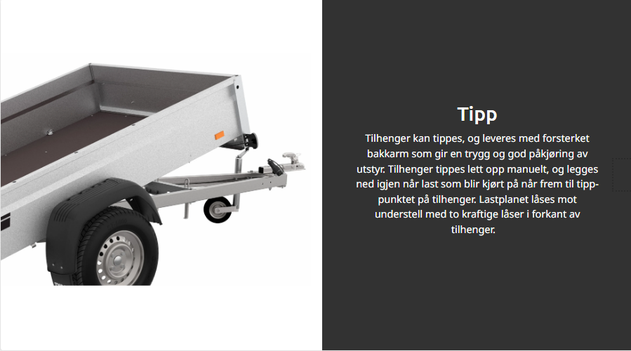 Med stort kassevolum, høy nyttelast, manuell tippfunksjon og forsterket bakkarm er 6277 svært brukervennlig for både gjør-det-selv-prosjekter og fritidsaktiviteter. Du kan enkelt kjøre gressklipperen, hagemaskinen eller ATV-en rett opp på lasteplanet, vippe opp tilhengeren for å tømme grus eller jord direkte på ønsket sted, eller frakte hageavfall eller flyttelass.