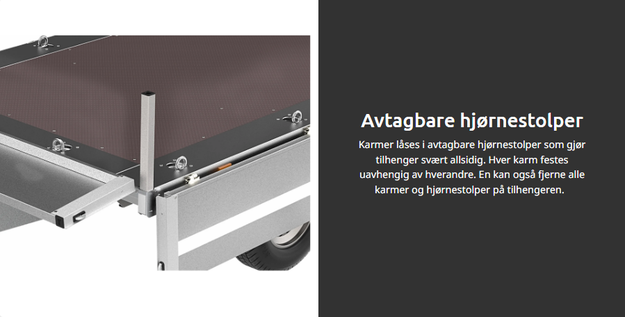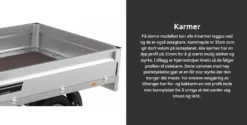 Karmene på 6301-modellen har fått et stilfullt oppgradert design, utstyrt med avtagbare hjørnestolper og elegante, innfelte karmlåser. For å åpne karmen vipper du ut det integrerte håndtaket i endebeslaget. Alle karmer kan åpnes helt uavhengig av hverandre, da de er låst mot en hjørnestolpe. Hjørnestolpene låser hver karm slik at de kan legges ned eller fjernes uavhengig av hverandre, og de kan også fjernes helt for å få et flatt lasteplan. For å forhindre utilsiktet tap av karmen er det en lås på hengselet som sikrer at karmen kun kan tas av når den står vannrett ut fra tilhengeren. I tillegg er det integrert feste for presenningstrikk i hengselet. Innfelte karmlåser gir enkel og trygg lukking av karmene.